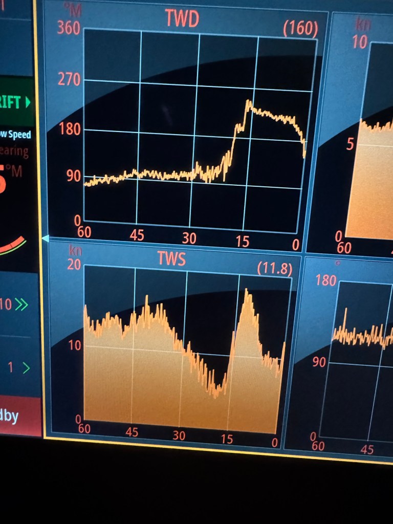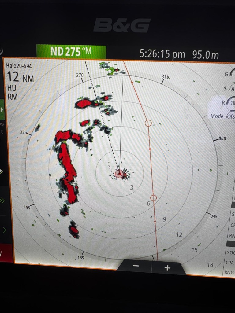 Crazy wind change, east at 7 to west at 18, in 5 minutes. 😬Squalls south n west of us. It’s not all sunshine and cool beverages